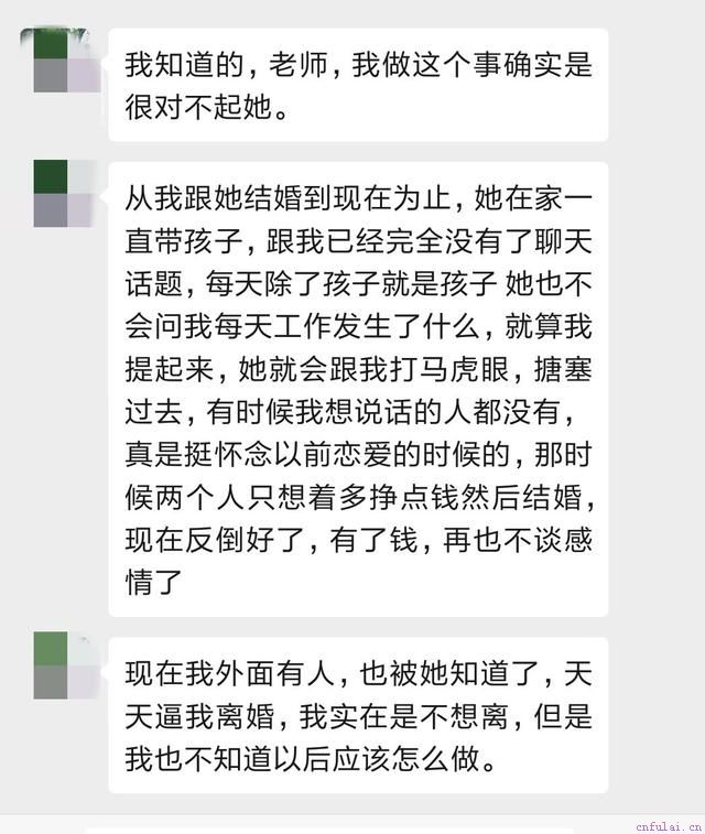 如果两人的婚恋关系本来就存在问题,男人在关系中没有得到满足,那他就会在关系外寻求补充。有些出轨男人从来没有想过离婚,却对伴侣有诸多的抱怨:或者因为在婚姻中没有得到妻子的尊重与关爱,才到别的女人身上寻求寄托;或者家中有一个强势的妻子,男人感到束缚,为寻找自由而反叛······一旦婚外情发生,他们的内心似乎一下子就找到了平衡,感觉婚姻并不那么糟糕,因此抱着玩一玩的心态维持婚外关系,不想投入太多热情。这是一个曾经找我咨询的男学员给我发的消息,没错,他出轨了。