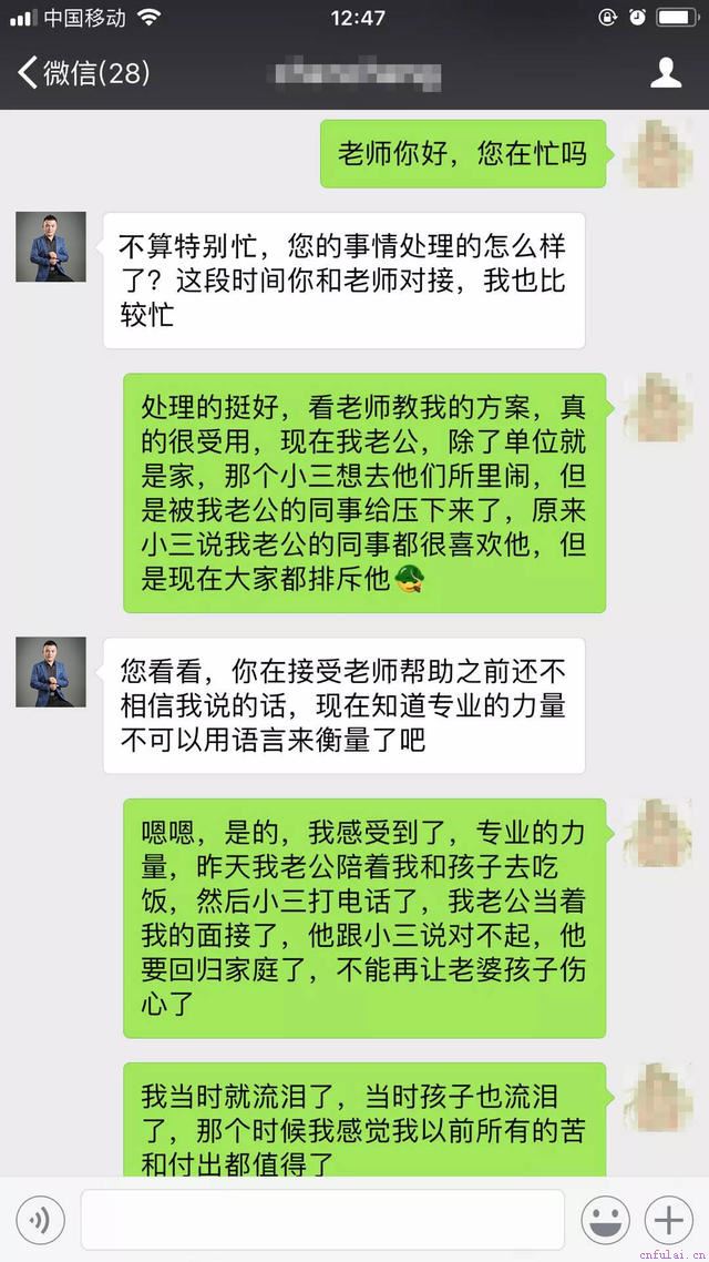 老师的分析都是专人专案,大众的挽回方法并不适合所有的情感问题,看到崔老师胸有成竹的样子,我感觉吃下了一颗定心丸。老师给我电话解答,我按崔老师的做法,认真做了7天,我老公的情况发生了逆转。他和小三彻底分手了,自己也不愿意和我离婚了,一开始我都还不相信。最后,小三上家里面来和我闹,我才知道原来这一切都是真的。