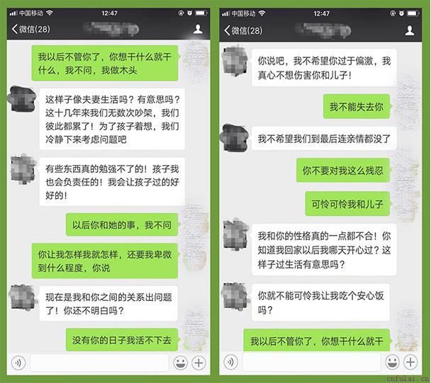 但是我看到朋友手机里的照片时,我的眼泪就止不住了,整个人好像被掏空了,内心的痛苦无法形容,甚至想到过一死了之。那时的我常常失眠,混乱了一个星期之后,我原本以为,只要我对他好些,毕竟这么多年的感情了,他感觉到我的好,自然就会放弃了。可事实不是这样,我越不吭声,他愈明目张胆了。在一些公开场合他也开始带着小三出现了。就这样一年半里面我忍受着自己的痛苦和内心的挣扎最终却更让他放肆!