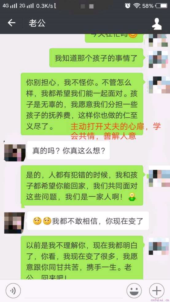 有了起色以后,导师指导赵小姐时不时的给丈夫发一些消息,尽管多数时候,丈夫还是不回复的,但她坚持传播正印象。时而发带孩子出游的照片,时而拍自己做好的可口饭菜。更多的时候,是赵小姐内心独白,但这些都有一个共同点,就是不引人烦躁。大概过了十天左右,两人的关系还是平平淡淡。程亚方导师让赵小姐断了跟丈夫的所有联系,第二天,丈夫就主动发来了消息。他自然是着急,妻子的音讯突然断了,不仅会不习惯,还会有所担心。这个方法就是一边刷新丈夫对自己的印象,一边潜移默化的打动丈夫的心,他虽然不曾频繁的回复,却时刻都在关注。有一天,这牵着的线突然断了,他自然心生失去的恐惧,这个时候便会主动找上赵小姐嘘寒问暖。