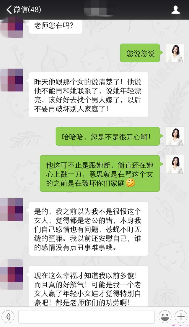 董芊工作室&遂心情感联合机构作为业内翘楚,我们不甘于平庸,而是追求卓越!不仅要解决眼前的问题,我们更要防患于未然——一次性解决习惯性出轨!马晓也是一样,虽然以后的日子还长,但最终完成这一阶段,从目前的反馈来看,老公未来出轨的可能性是很小了!是啊,每每帮助原配成功驱逐第三者,感情重回甜蜜,都是让作为情感行业专家的我们最欣慰的时刻。婚姻是神圣的,有且只该有彼此相爱的两个人而已!