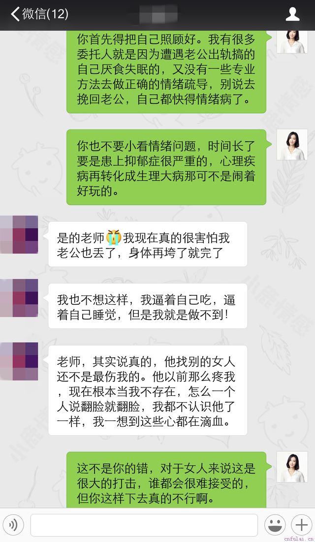 如果你也想有爱有伴,独独没有第三者,请添加工作室负责人董芊老师本人微信:#微信#别人有的,我们都有!而我们有的,别人要么没有,要么不比我们更专业!女性遭遇出轨,情绪就已彻底崩溃,连饮食睡眠都无法自控,还怎么谈赢回主场?就像马晓一样,一开始面对老公出轨,天天以泪洗面睡不着觉,即使委托我们进行原配维权服务,可无法让她回复正常生活状态的话,挽回从何谈起?
