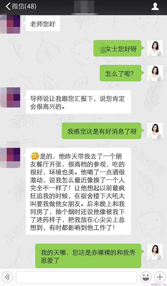 这时针对用户的框架则会侧重在原配维权的第二阶段——手撕第三者。在这一阶段导师会利用分离第三者的专业手段、丰富的实战技巧及连普通人想都想象不到的心机套路,去分裂男人和第三者之间的粘性,并强力的帮你将他吸引回身边,让他最爱你、只爱你!果然,这一阶段告一段落时,马晓兴奋的再次来炫耀自己的战果了: