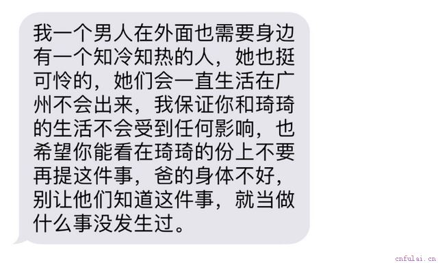 当作什么都没发生?当作什么都不知道?不,不可能,我做不到,我从小就是一个要强的人,我无法容忍和另一个女人共享自己的丈夫。我无法容忍另一个女人操控着我的丈夫对我们的婚姻指手画脚,更无法容忍原本属于我和孩子的幸福这样活生生的被掠夺。