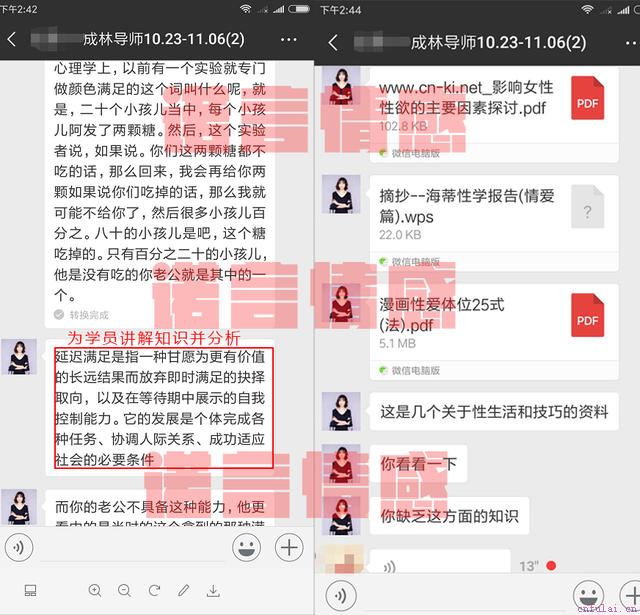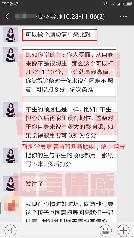 她害怕这个孩子的出生,形成家外家,在万般无奈下,周女士联系了诺言情感,希望能够让老公与第三者断绝联系,别让这个非婚的孩子出生。(为保护学员隐私,人物名称均为化名,具体细节已隐去,图片均来自于群主客服班主任截图)