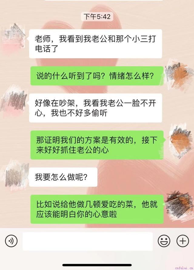 第二天一早他就出门了,连个招呼都没打,一连几天电话也不接,人也不回家。现在比起生气,我更多的是绝望,我从前没有怀疑过这个让我奋不顾身的人,也不知道那个女人是什么来路这种丑事也不知道怎么跟家人朋友开口,我不想我打造的美好婚姻让大家看笑话,我在网上疯狂的搜索怎么让老公回心转意的方法,才找到了诺言情感,抱着试一试的心态加了老师的微信开始还有点犹豫会不会不靠谱,没想到老师听我描述完情况,马上就帮我分析出,我在这段感情中的问题,指导我该怎么做。