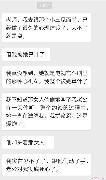 跟第三者见面,原配其实是吃亏的。因为丈夫的心当前属于第三者,他跟你的感情处在落潮期,而跟第三者的感情处于涨潮期。妻子本能就想赶走第三者,所以恐慌、焦虑,因为焦虑而恐慌,又因为恐慌而焦虑,这是一个恶性循环:越想赶走第三者,越想打击的第三者体无完肤,就越容易黑化自己。