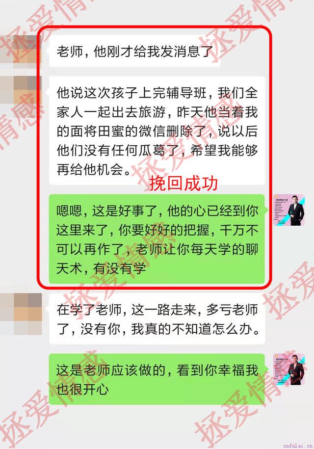 突破防线击溃第三者婚姻专项组导师针对第三者不同性格特点,找出第三者的内心防线,指导学员进行侧面进攻,第三者在心理防线被击溃后,从而自乱阵脚,甘拜下风,被排挤出局好好的一段婚姻就这样被狐狸精给破坏了,你伤心欲绝,你不甘心,想守护自己的婚姻,想让他挽回你,想成为他唯一捧在手心里的女人,那么点击,添加老师微信,让老师教你如何守护你们的婚姻,老师会用专业的知识帮你驱逐小三,教你如何高姿态吊住男人心,让他主动挽回你。果不其然,在导师的指导下,在挽回的第19天,晨曦给导师发来了好消息。