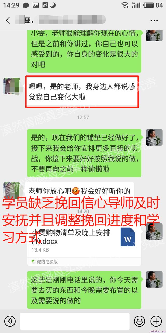针对小雯和小刚的实际情况,导师制定了一套完整的挽回方案,因为很多设计到实际情况的,我今天只在文章里给大家分享大概挽回过程。导师并没有第一时间直接帮小雯做挽回,其实是因为在之前小雯有做过错误的挽回方式,制造危机感本身并没有错,但是用错了时间只会让对方觉得反感,严重的会让对方觉得我们对于感情不忠诚,小雯的挽回反而让小刚有了更多负面印象,所以我们的先通过时间和一些事模糊掉对方对我们的这些印象。