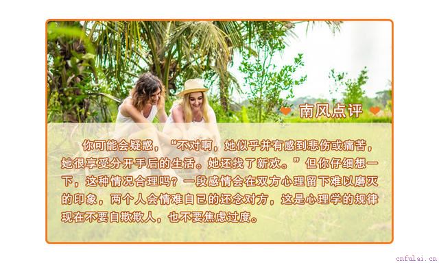 分手不能代表感情的戛然而止,一段真心付出的感情不会说断就断,分手后的痛苦感觉就是这段关系的延续。麦克斯韦尔·马尔兹著名的21天效应发现,医院的整容客户需要大约21天才能习惯看到自己的新面孔。当患者的手臂或腿被截肢时,在约21天内,他们仍能感觉到自己已经截去的肢体。所以说,人类旧的心理形象消失,新的心理形象建立,需要花费大约21天的时间。伦敦大学学院的心理学家PhillippaLally在2009年研究发现,人们忘掉旧习惯、创建新习惯的过程需要3个月以上——确切地说是66天。换句话说,如果前任想想忘掉你,开始全新的生活,这可能会花费TA三个月到八个月的时间。看起来果断的分手其实是难舍难分。当伴侣长期在一起时,特别是已经习惯了彼此依存的关系中,两个人共同的依赖感会在分手后缺失,会感觉丢失了自己所关心的人,也失去了习以为常的陪伴,分手的痛苦就是源于这种孤独感。