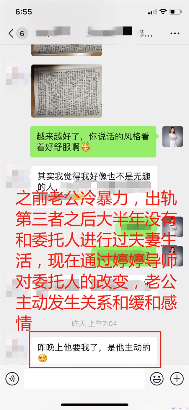 因为其实兰兰老公每天都会回家,所以其实对于兰兰的改变会直接展示的更方便,所以我们先是安排了兰兰在老公上班时间去进行了外在形象的改变,把以前的黑色短发换成了现在的酒红色卷发,一方面给老公新的感觉,一方面也更显女性魅力,从视觉上影响老公的看法,之后就是通过每天的电话指导的形式,给兰兰指导关于如何提高情商和男性心理理解能力等。