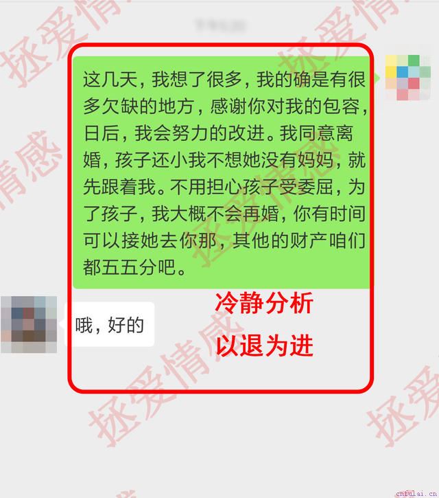 在小赵提出离婚之后,文婷一直没有给予正面的回应,这种做法和死缠烂打没有什么区别,会让对方内心竖起防御的高墙。导师指导文婷用平静的口吻给对方发一个消息,告诉对方同意离婚,降低对方内心的戒备心。这几天,我想了很多,我的确是有很多欠缺的地方,感谢你对我的包容,日后,我会努力的改进。我同意离婚,孩子还小我不想她没有妈妈,就先跟着我。不用担心孩子受委屈,为了孩子,我大概不会再婚,你有时间可以接她去你那,其他的财产咱们都五五分吧。