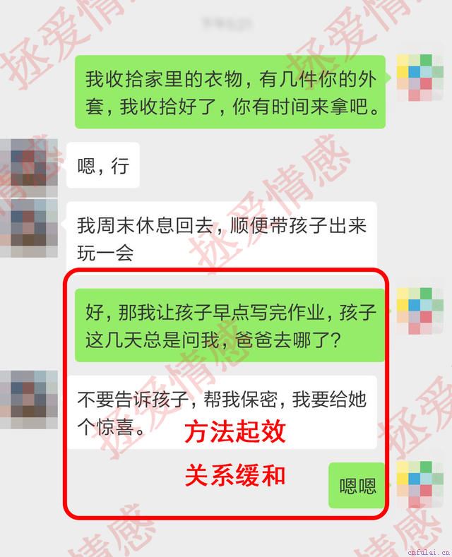 爱一个会不断的去付出,而留住一个人要学会让他付出,他付出的越多,离开的成本越高,感情也就越稳固。这次孩子感冒发烧了,学校老师让家长去接孩子,导师指导文婷给小赵打电话,帮其准备了话术,就这样小赵带着孩子去医院看病。文婷下班后直接去医院,对小赵表达了感谢,小赵说,养孩子真的不容易,孩子这么大了,我是第一次带孩子来医院,谢谢你这些年的付出。明显的看出小赵渐渐的理解了文婷的不容易,已经对自己以往的行为开始反思。文婷过生日,导师安排孩子给爸爸打电话,小赵直接将电话打给了文婷说,晚上不要做饭了,我们出去吃吧。小赵订了一个温馨的餐厅,在吃饭期间,一直在深情的望着文婷,孩子在这个时候说,爸爸,你回来和我们一起住吧,家里没有你,妈妈晚上都是反锁着门。文婷则赶忙转换话题说,今晚的蛋糕还不错。小赵拉着孩子的手说,好,今晚爸爸就回去住。历经15天,两人成功复合。