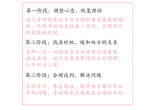 通过导师指导双方第一次制造机会见面以后,他的态度有些缓和了些,导师就让王双趁热打铁赶紧把离婚的问题解决了。按照导师给王双制定的具体策略:断联修复战略、欲擒故纵战术、心理攻坚战、防御战术,王双一步一步的取得了谈判大捷。