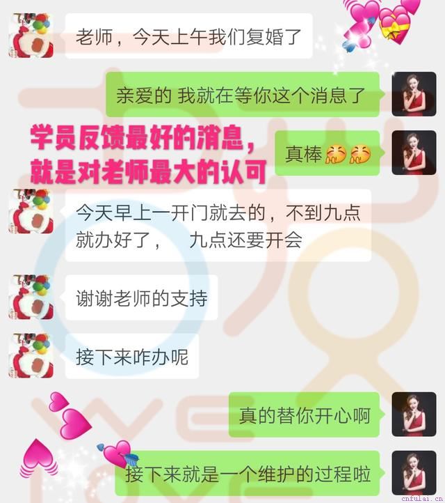 随着前期关系拉升铺垫,夫妻关系不断回温,通过导师安排学员进行了话题暧昧测试和调侃测试以及肢体亲密度测试之后,复合窗口逐渐开启。因为前期的关系铺垫和情感拉升已经做的足够到位,珊珊对方辰的态度有了非常明显的改观,最后的挽回行动因为涉及学员隐私,而且操作比较简单,就不在文章中详细说明了,方辰在导师30天跟踪指导下,成功了挽回了妻子。