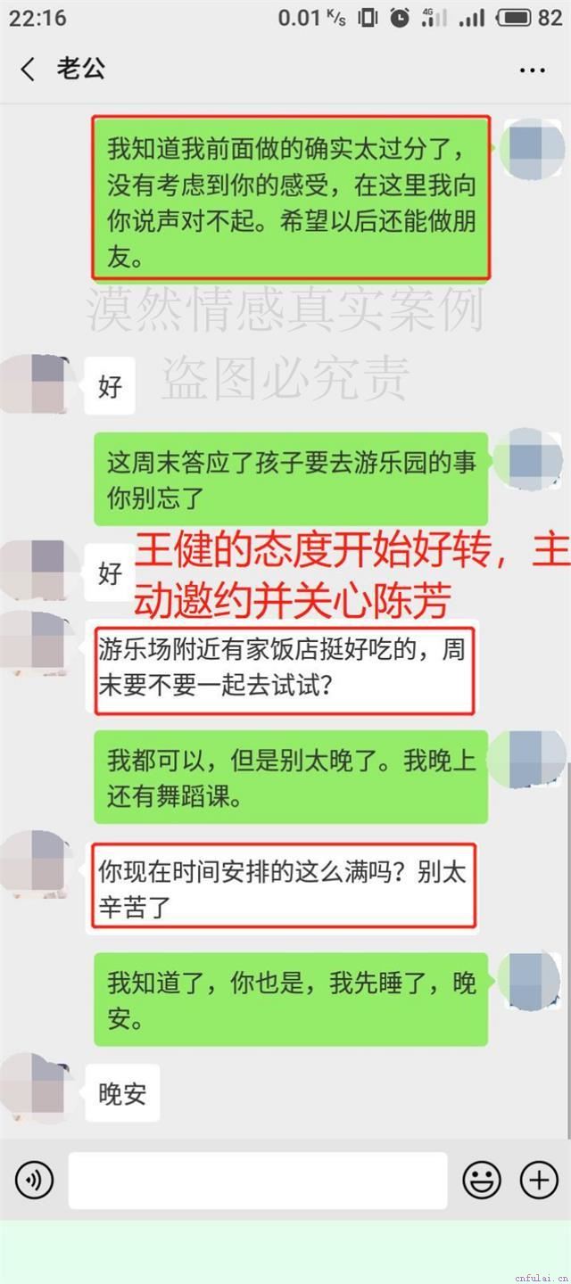 在陈芳进行内外在改造后,王健回家的频率开始增加,我们让陈芳在王健在家的时间里积极与他沟通,但是又不要刺激王健的情绪,增加亲密感。我们让王芳在王健有空时,就带着儿子出去玩,并且在将美好的瞬间都记录下来,建设自己的朋友圈,把亲子纽带维系好,王健挂念儿子,自然会联系陈芳。沟通增加以后,感情会有一个破冰期,在此期间,可以多引导王健回忆起以前美好的回忆,多让王健能够表达自己的情感。王健虽然没向陈芳服软,但是态度已经转变了很多,而且还答应和陈芳一起带儿子去游乐场。