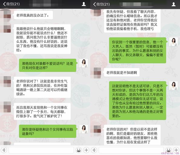 作为专业人员,给你分析一下,为什么王旗这个男人会这样呢?1. 正如老师在截图里给蔡女士分析的,王旗一定是有沟通需要的,而和妻子沟通渠道的关闭,进一步使得他的倾诉欲更需要得到宣泄。否则他就不会愿意把时间花在和男性友人、女同事身上,和他们有讲不完的话了。2. 王旗不再愿意和妻子说话,是因为她怀孕期间、生孩子后的头两年,他们早就无话可说了。老公那个时候还愿意和她说的时候,她只顾着自己抱怨,听不进老公的话,更不说做出感情的回馈了,这近3年的负面情绪积累,让王旗逐渐的改变了自己对妻子的看法你变了,不再是我认识的那个好朋友,我们不再无话不谈。你变成了一个只想让我听你说,你自己却从来不听我说话的、无趣且烦人的妻子。反正我说什么你也听不到,听到了你也听不懂,也许听懂了你也敷衍不走心的回应我。那我作为一个男人,和你说什么都是浪费时间,我唯一的选择就是——闭嘴。3. 即便你不相信专业机构,也请相信科学数据!美国情感婚姻治疗协会显示的大数据:男人的闭嘴就意味着你们已经进入了无声婚姻,离破碎的婚姻,只有一步之遥!没错,不要以为男人不理你是小事,我们太多的委托人证实了,男人不再愿意和你沟通后,不用多久,他就会突然的坚决要离婚了!4. 我当时告诉蔡女士,王旗虽然暂时还未出轨,但是他既然选择了和自己最好的朋友结婚,就说明他是非常在意感情中的友谊感的,而友谊感和核心就是情感上的沟通交流,说明他们婚姻已经伤到了根基!王旗现在和女同事俨然一对无话不说的密友,即便文字聊天看起来还比较中性,但老公已经表现出精神出轨的趋势!做妻子很辛苦,既要做男人的好老婆、又要做孩子的好妈妈、还要做婆婆的好儿媳,照顾好家庭。千万不要让自己裹挟在生活琐事中,让别有用心的女人趁虚而入!如果想从今天开始改变,做最轻松的事,得到男人最真的心,就赶紧添加老师#微信#!进行专业一对一咨询(每周限2个免费名额,可排队预约,以添加时间为准。)幸运的是,蔡女士没有抱着侥幸心理,认清了老公不理她这件事的严重性,选择了相信我们机构,委托进行了一对一的婚姻修复/重回热恋的服务。由于服务全程为本机构商业机密,不可外泄,我节选了少许内容,希望能给面对一个冷漠老公的你,些许启发。