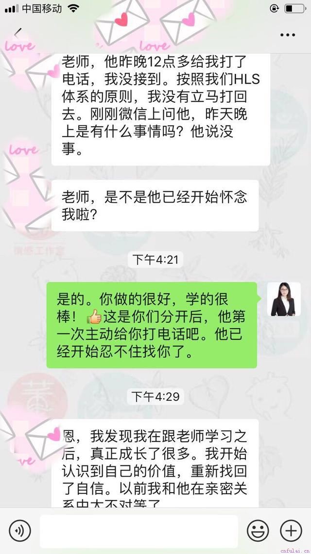 大家好,我是情感导师马国,HLS(High Level Solution)体系创始人。在我专注情感教育的十几年间,致力于传播新型情感心理学理念,帮助学员找寻真我。截止到2019年5月为止,我已经帮助数以万计的女性成功解决情感困惑。我的服务理念是:只要你不认输,我就能帮你找回幸福!所谓挽回,本质上就是一场心理战。挽回的核心就是要利用男人的心理弱点,从心理上攻破他的防线。今天就给同学们分享一个「利用男性心理弱点」成功挽回的案例。希望可以给学员们一些指导及启发。
