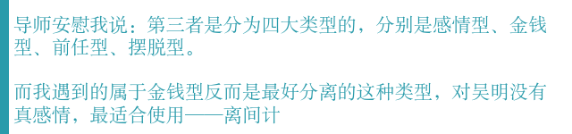 导师让我买了一张当地的电话卡给寄给老师,并要走了狐狸精的一些个人信息,并亲自联系了吴明其中手段非常之多,也很高明简直让我无法相像,在这里我就不一一阐述了,想要看全过程离间计可以点击#微信#添加老师微信,在老师朋友圈里有很多分三的方法都很实用哦。