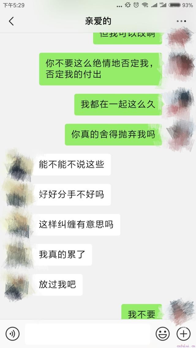 后来又因为一次矛盾,我们冷战了两个星期,他也没来找我,后来我忍不了了直接找他闹,我们吵得很凶,最后他提了分手。我以为只是气头上说的分手,等我冷静下来之后,去找他和好,给他发了很多信息,打了很多电话,但是他态度非常冷漠,说跟我已经过不下去了,觉得很累。之后不管我怎么服软道歉,发了很多信息,他都没有再回应我了。