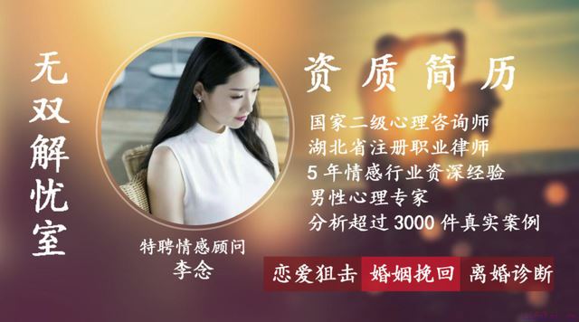 如果你确定你在情感、婚姻问题上确实比较迷茫,需要专业的情感咨询师帮你诊断情感问题,解决婚姻难题,你就可以李念老师微信。我会从法律和心理学两方面入手,根据长年的从业经验,为你解决困扰许久的情感婚姻问题。