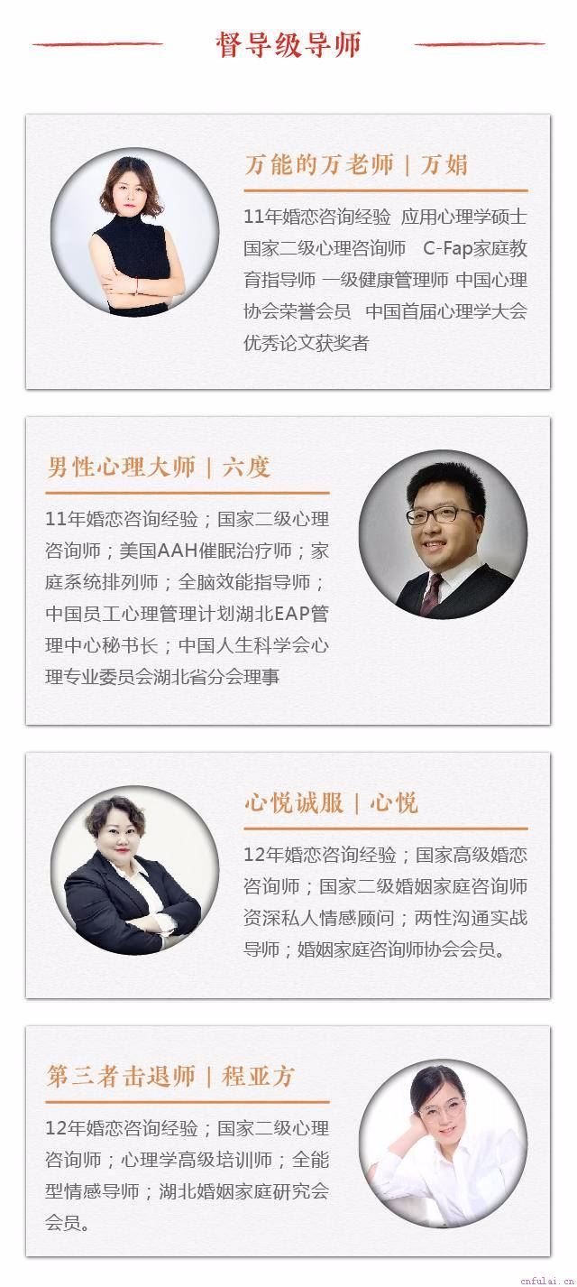 当然,我是幸运的,因为无双解忧室督导级别导师程亚方老师的一对一帮助,不仅仅帮我挽回了我这辈子的幸福,更重要的是她们教会了我如何经营爱情,如何让爱情保鲜,让感情永驻。(如果你想更加深入的了解督导级别专家具体是如何帮何娜分离第三者、如何帮她让男友回心转意的,你可以添加李念老师个人微信,与她详细的聊一聊,或许困扰你的谜题很快就迎刃而解了。) 我们为什么能帮你?此时此刻,你的心里肯定产生了疑问:我是否真的能够帮你?