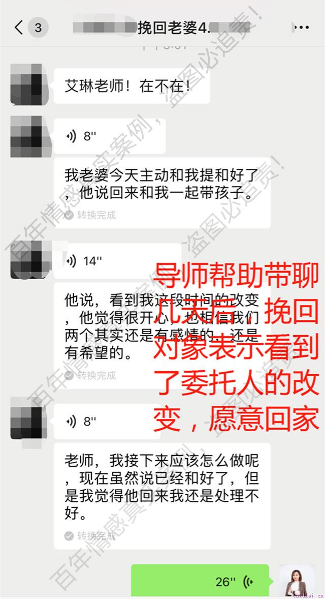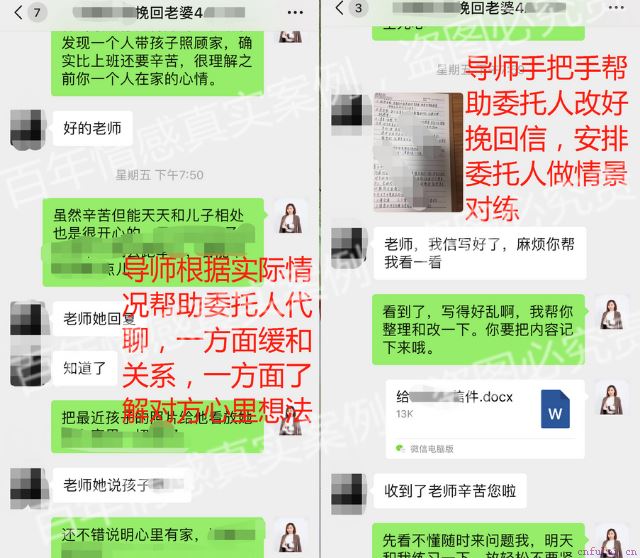 想了解具体导师帮助挽回详细过程的同学可以在添加老师的微信#微信#,老师会定期在朋友圈分享一下挽回经营和挽回干货,另外今天前10名添加成功的学员将会获得价值1599元的系统情感测评,通过测评告诉你挽回的成功率及挽回操作步骤。 百年情感服务流程 我们情感导师帮助的挽回的话是委托人办理服务之后,分析师会整理委托人的资料,带委托人填写一份委托人档案表,双向资料提交,在大数据库里为委托人筛选出类似情况处理成功案例最多的,最能帮助到委托人的导师,导师会了解委托人的情况跟委托人进行首次通话。 首次通话会深入剖析委托人的感情问题,做一次系统的情感诊断,第一通电话非常重要,委托人最好是要把详细的情况再和导师说明清楚,同时也可以准备一些自己认为比较困难的问题到时候去问服务导师。然后第一通电话结束后,我们导师团会拟定符合委托人情况的挽回方案。 这个方案是根据委托人双方的性格特征、成长环境、过往感情经历等等制定的动态修改方案,会针对性的手把手教委托人,方案会具体到每一天当中,导师电话里会给委托人布置任务,会在电话里了解委托人的感情现状,分析问题,委托人需要在微信上及时的反馈自己的情况。 另外服务结束之后服务导师会对委托人这段时间的学习成长进行总结,以及会预测委托人这份感情未来可能会发生的问题,会帮委托人列出来,然后告诉委托人应该怎么去避免,或者怎么去处理,最后导师服务完全结束之后,也会把委托人的档案转交给分析师#微信#,后期分析师也会对委托人的情况进行长期跟踪的。 婷婷导师·挽回心得 没有追不回来的爱,只有没有方向、没有思路的焦头烂额,如果你不想放弃这段感情,想要回到温馨的家,那么现在点击添加#微信#,不仅会获得一次免费咨询的机会,还会赠送适合你情况的挽回福利哦!婚姻就像一面镜子,透明而易碎,需要夫妻二人共同拿起,共同呵护,否则稍不注意,就容易跌落在地,碎得七零八落。无论如何,婚姻总归是一门高深而又博大的学问,女人要学会用自己的真心去经营,让丈夫感觉到自己的爱,感觉到婚姻的意义,能够一直信心满满地和自己携手走下去。而这个信心,需要男人自己创造,也需要女人去赋予。