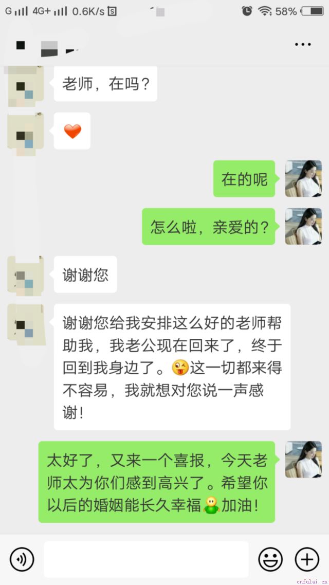 就在服务即将结束的前3天,小芹给我发来了喜报,她说,真不敢相信老公竟然这么快回来,都不敢相信挽救婚姻原来这么简单。