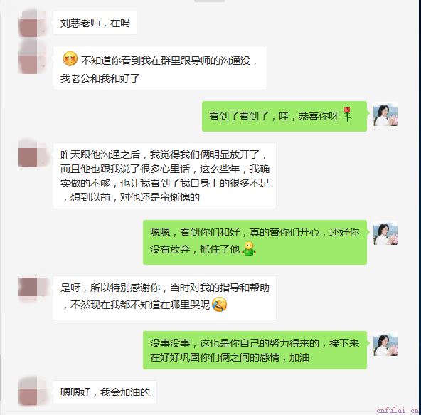 →利用心理引导让老公自愿离开第三者 老公出轨说明你处于弱势,而第三者比你优秀而处于优势,这一局面对婚姻的修复是相当不利的。因此一定要找出第三者的弱点。 那什么是第三者的弱点呢? 很简单只要抓住插足别人家庭这一点,让老公明白第三者以后可能也会对他做同样的事情,让老公对你渐渐产生信任,而疏远第三者。 →引起对方的共振,并针对问题,做出规划 也许在你们关系好的时候,你们曾经有过各种约定,但由于种种原因没能实现。比如当初约好的去某个餐厅吃饭,然后通过网络把这个发出来,只对他可见,顺利的把他约出来之后,在针对之前的问题,慢慢的理清楚,给各自一个机会。 在这个阶段,很考验Cindy的耐心,在导师一步步的调节下,老公终于对Cindy打开了心结,说出了自己的想法。谈到最后,两个人相拥而泣,Cindy终于挽回了老公。