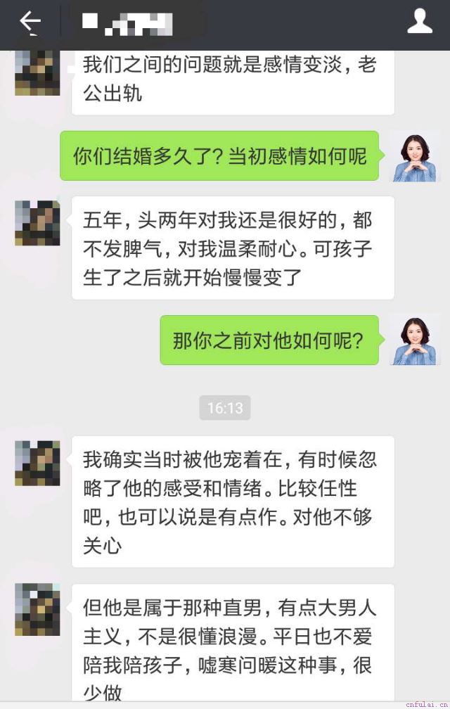 所以,情感危机不可怕,可怕的是你没方法!只要你还放不下这段感情,想尽全力重获挚爱,让自己不留遗憾。那么你可以通过#微信#咨询老师,回复899,让专业老师为你的情感烦恼把关! 为什么你会遭遇婚外情危机 小清是我的一位读者粉丝。她从一篇情感干货分享文中,获取了我的个人微信#微信#,并向我留言:为什么感情转淡、婚姻变质,试图挽回的总是女方?逃避的总是男方? 我猜她一定是遇到了什么棘手的感情麻烦,比如遭遇第三者、丈夫提出了离婚之类,危急之中,才会求助于我。 果然,没几句小清就竹筒倒豆子般述说了她的情况: 她跟老公恋爱三年才结婚,原本感情基础还是不错的。结婚的头两年,老公对小清还是挺好的,不爱发脾气、态度温和。问题是从孩子出生后,慢慢开始显现的。 我问了一句,那当时你对他又是如何的呢?小清也许愣了几秒,又仿佛是认真回忆了一下,半晌才回复我:那时候我沉浸在老公的宠爱中,确实对他不是很关心,有时候还有些任性。