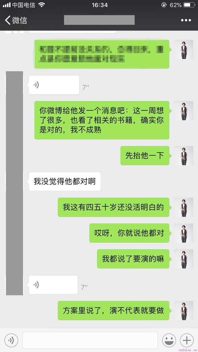 在我的指导下,小美跟男友在微博上进行了一次很走心的互动。男友告知小美,这大半个月以来,他都在处理跟前妻之间的问题。如今问题都解决了,他才发现,失去和得到是多么的让人珍惜。当天下午,重新加回微信的男友,开始主动关心小美有没有吃饭。聊到这里!挽回成功的可能性,已经八九不离十了。为验证结果,第二天,我给小美发出了最后一条指令,确认男方是否已经和好。几分钟后,小美发来了跟她男友的聊天截图。故,本次挽回完结撒花,嘻嘻!