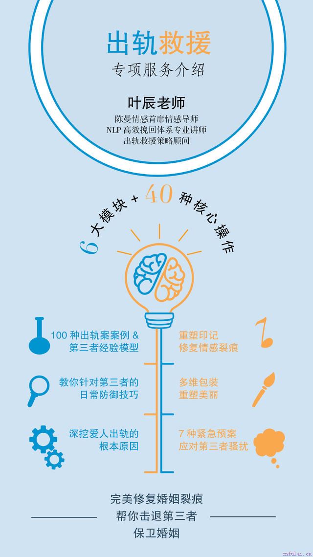 坦白说,出轨救援专项服务本身的价值就在几万元以上,它是陈曼情感综合过往100种经典出轨案例,搭建出的一套第三者经验模型,包含6大模块和40种核心操作。目前之所以将它纳入一对一挽救婚姻高级指导的服务内容,单纯只是为了回馈多年来支持和信任我们的学员。