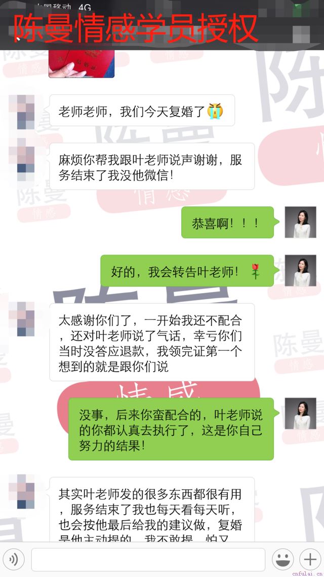 如果你现在觉得还是似懂非懂,依然不知道如何解决眼前棘手的婚姻问题,没关系,你只需要记住一点:感情是流动的,它有它的规律性和周期性,衰败的感情依然有再次复苏走向繁荣的可能性,只要你将这段关系交给专业人士来处理。可以点击#微信#添加老师微信,把你遇到的具体问题告诉老师,我们会结合你的情况帮你做一次情感策略分析,你会更快明白这段婚姻的症结所在,也能更快掌握分离第三者的窍门,把第三者赶出你的婚姻。下面,我给大家分享一个陈曼情感工作室的学员案例,让大家能有一个更直观的感受。