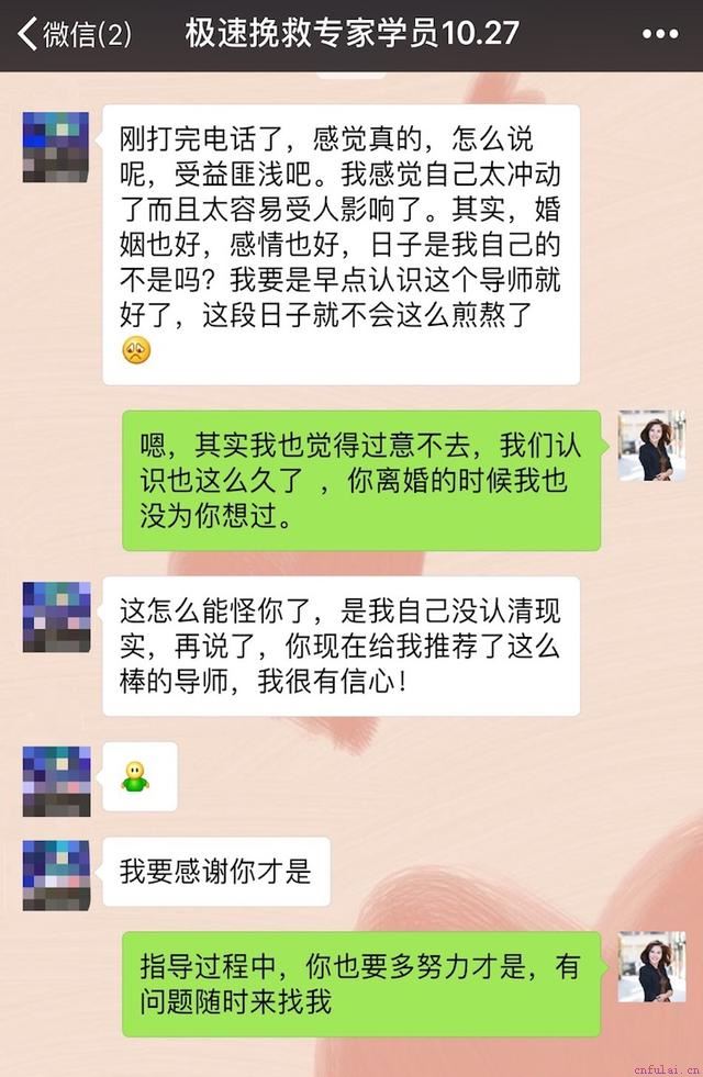 小柔根本不想离婚的啊!当时要不是各方面压力,她为了所谓的面子,怎么也不会走到离婚这一步的啊!小柔得知我的工作内容正好跟情感挽回有关,请求我帮她联系咨询师。看着她坚定的目光,以及这段日子我亲身所见所闻,我很快帮她办理了极速挽救专家的婚姻挽回服务。很快,小柔接受了咨询师的第一次一对一通话指导,结束后她很开心地给我发了微信。