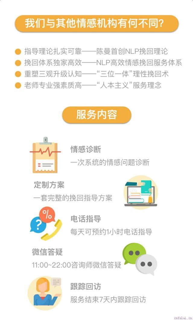 这套咨询服务包含了挽回情感路上需要用到的方方面面的技巧和内容,为了发挥咨询服务的最大优势,陈曼情感机构还特别设置了互动答疑、经典案例解读、紧急求助、情感能量评估等等贴心环节,还包括专门针对第三者问题的出轨救援专项服务。