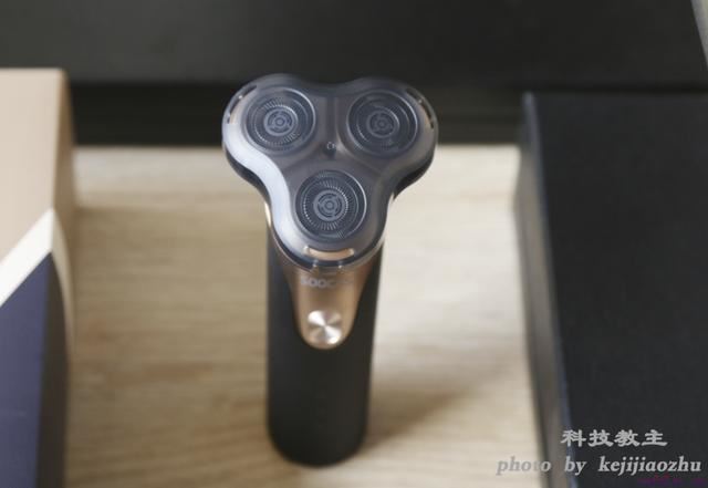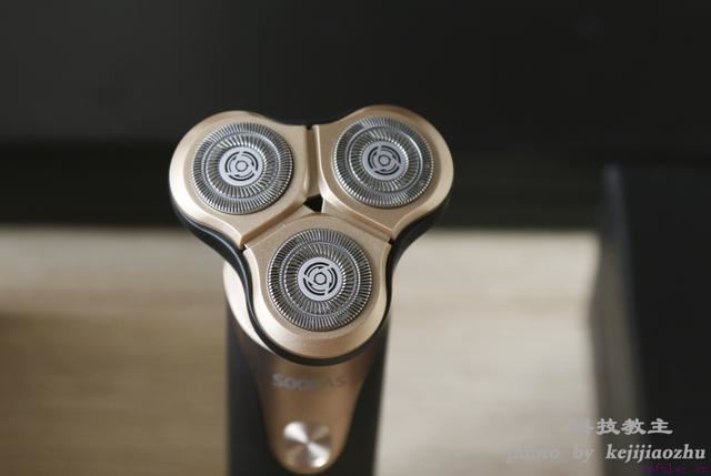 素士凌朗S3机身中上部为刀头部分同样是黑金撞色,刀头上部由3个线条分明的环形的双层刀片组成,听老公说这样的设计能够更好地一次剃更多的面积,大大的提高了剃须的效率,而且超级贴合面部。