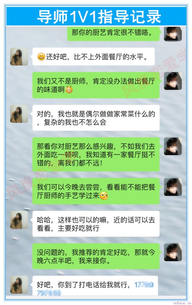 这个学员之前已经和相亲对象,聊了一个星期左右。经过导师全程的聊天指导,已经了解清楚女生的兴趣爱好,再加上女生对他的印象也不错,平时聊天也比较聊的来,那这时候约女生肯定没问题。如果前面的聊天,都没办法让女生感兴趣,那女生对你肯定没感觉,你就算知道她的爱好去约她,也很难成功,后面导师根据女生下厨的爱好,教学员直接约女生一起吃饭,女生果然答应了学员的邀约,愿意见面约会,这说明学员又更进一步的和女生发展了。学员获得了约会的机会,导师也会给他进行约会聊天的指导教学,帮助他和相亲对象培养感情,然后确定恋爱关系。你也可以达到这样的效果,点击添加导师为好友,跟导师1对1交流,我会手把手教你聊天,帮助你追到喜欢的对象。