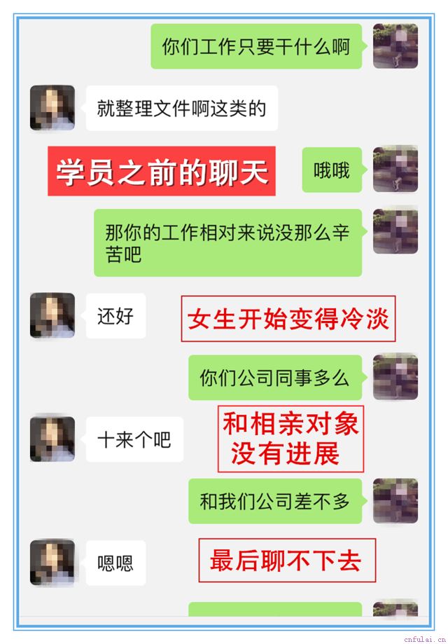 聊天聊的好不好,从女生的反应中就能看得出来,如果女生经常不回复你,或者回复消息很慢,回复的字数很少,就说明女生没有兴趣和你聊天。为什么女生会没有兴趣呢?关键原因就是:你的聊天话题太无聊了,女生和你聊天都不开心,怎么可能还愿意和你聊呢?刚好导师这边有个学员,他之前也是不会聊天,和相亲对象一直都没有进展:
