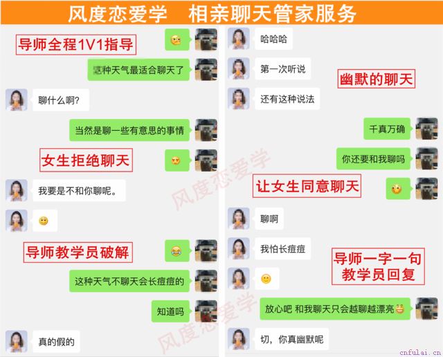也许你再也受不了和女生聊天总是聊死,也许你不想每次相亲都没有结果,也许你想提升自己,让女生喜欢上你。这些问题对于毫无经验的你来说,可能会很困难。但是,风度导师可以很负责任的告诉你,只要你成为我们的学员,这些通通不是问题,下面就是我们学员的案例: