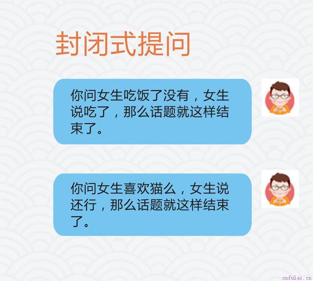 对于封闭式的提问,对方只能使用是、不是或者一个词来回答问题,而查户口就是连续的封闭式问题。举个栗子: