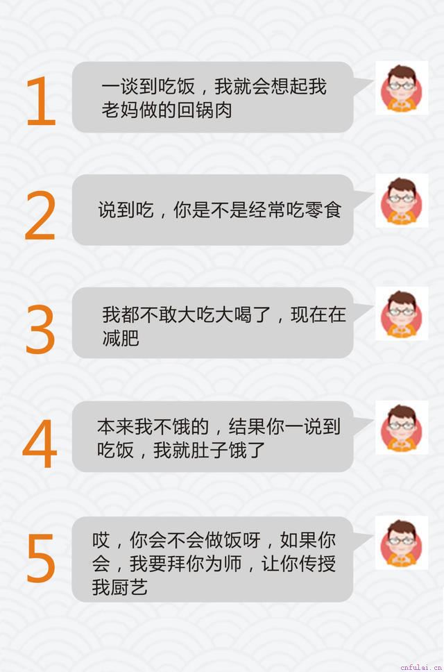 顾名思义,就是不断地开启新的话题,在一个话题上做扩展和延伸,从而达到有无尽的话题可以聊。这个方法的重点就在于,你要有丰富的想象力和发散思维能力,抓住女生话题中提供的信息后,用它去扩展话题。这样你就不用再担心没有话题而聊不下去了。什么叫发散性思维?举个栗子:在平时,我们是不是都会聊到吃饭这个话题?说到吃饭,你能联想到什么?