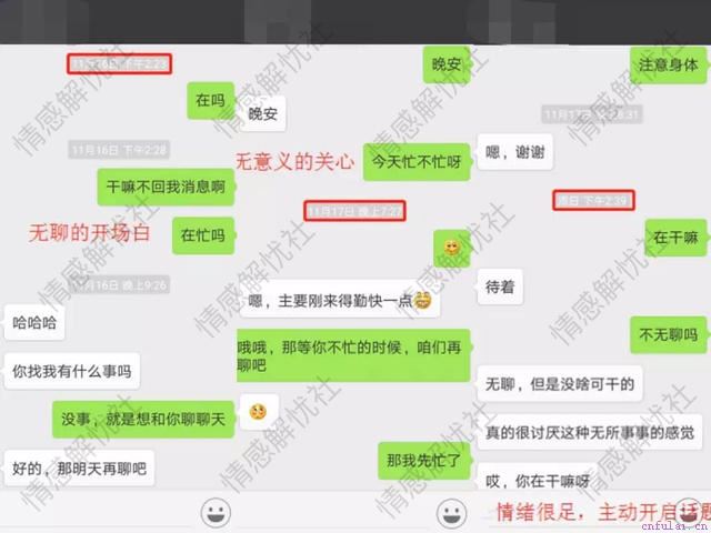 和女生聊天,就是要挑动她的情绪,让她觉得和你聊天不无聊,而且很嗨。但是有的男生只会很呆板地问女生:在没在,干嘛呢,吃了么,诸如此类毫无灵魂的废话聊天,女生只能机械地回答你的问题。女人在闲聊的时候,80%的话,都是自己当时的情绪,没有意义,没有逻辑,而且思维发散。所以不用在意她们的话是不是用词准确,逻辑通畅。聊天就是要学会和她沟通情绪,而非实际对话内容。