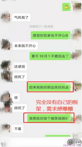 先看下错误的案例:男:你好,很高兴认识你。女:你好。男:我叫xx,你呢?女:我叫xx。男:你多大啊?做什么工作?女:26岁,财务。男:做财务的女生很细心啊。女:嗯。这种聊天方式是我接触的案例中最常见的一种。很多兄弟觉得没什么问题,几乎和所有的女生都是这么聊的,但最后的结果竟然都是女生慢慢的对你回复冷淡,那问题到底出在哪里了呢?你们俩刚认识就急切的想了解女生的各种信息,从头到尾,聊天过程中一直在提问,你自己也觉得尴尬。出于礼貌,有些女生会选择勉强选择继续回应你。男生误以为女生对他是感兴趣的,于是继续追问,慢慢的女生的态度变得越来越冷淡,甚至不回复你!!!