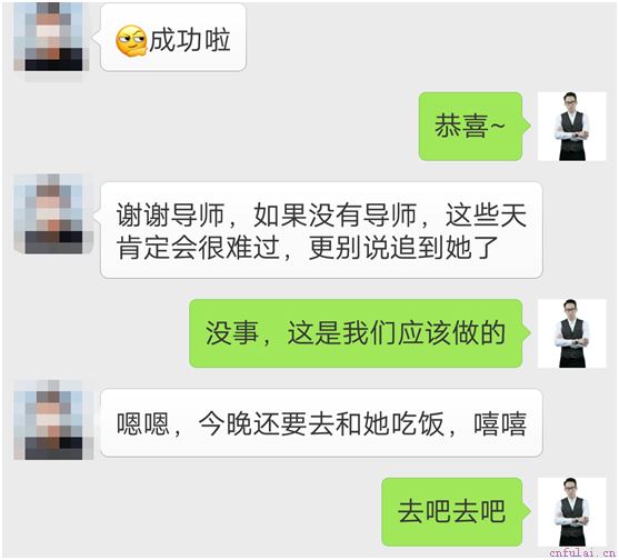 之后王金又让朋友做了个局,在酒吧,改变形象后的王金落落大方的走到对方面前,说了句:嗨,好久不见,没想到你也在这里。对方明显很惊讶,在聊了一会后,根据咨询师的指导,王金说:我朋友还在那边,要先过去了,有什么事,微信联系哦。当然,整个过程中大方自然,切不做作。这样做的原因,便是在对方心里重新植入一个全新的印象,去除掉以前那些不美好的记忆。果不其然,另一天对方主动发来微信,王金也按照咨询师教导的话术回了。