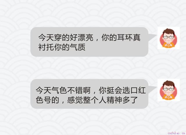 这种夸人夸细节,会让对方眼前一亮,不会简单敷衍的应对你的回复;而且注意刚刚我们夸赞时挑选的细节:耳环和口红色号,这都是一般男生都注意不到的小细节。一个女生如果听到一个男生居然能注意到这种细节,只会觉得:小伙子,你有眼光啊。