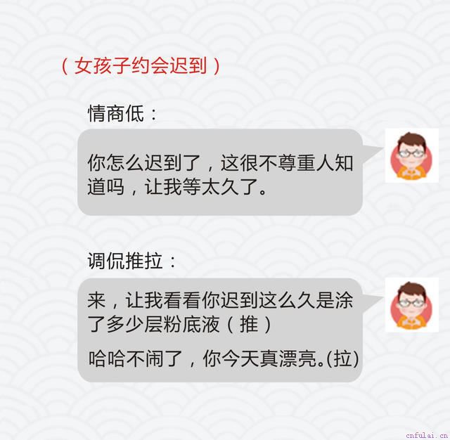 当你走完前三步的时候,其实你已经可以建设一个比较好的社交氛围了,但是我知道你的目的不仅仅在此。那么接下来就是聊天中的进阶服务:通过推拉的方式让你的聊天中带有情绪起伏。推拉的技巧其实我们很多时候都在用,而且这种技巧往往能带给我们聊天更多趣味,仔细观察我们聊天时那些有意思的话语和段子,其实至少七成以上都是推拉。何为推拉?说白了,就是欲扬先抑,先退后进,先推开给你一个低潮,再猛的一拉,让你惊喜,能够给女孩子带来不一样的情绪体验。很多人理解推拉,理解成了我要先损一下女孩子,先嘲笑她一下,其实这并不正确,因为你很容易一下子把女孩子推远,甚至把女孩子惹毛。所以推拉的推,一定要幽默的说出来,让女孩感觉到你在开玩笑。举几个例子来说明一下什么是情商低,什么是调侃推拉。