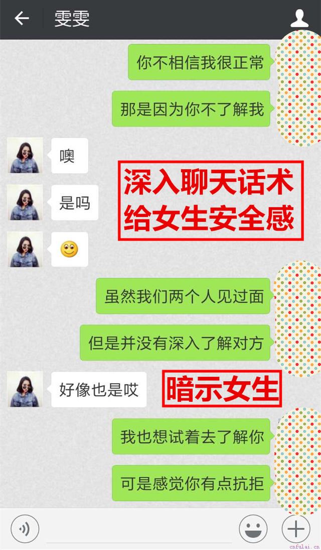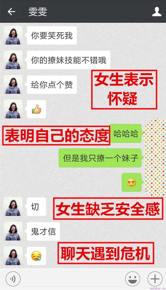 虽然一开始聊的很不错,但是女生缺少安全感,觉得学员很会撩妹,表示怀疑,这时候很多人就不知道怎么处理了。因为学员和女生不怎么熟,女生也不了解他,她不相信也是很正常的事情,我们谁也不会随随便便相信一个不了解的人。接下来要怎么办呢?我们继续往下看: