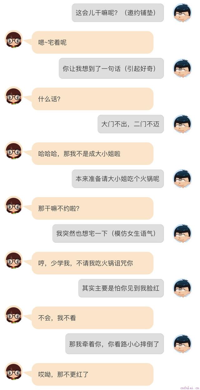 两人聊天舒适时,可以邀约铺垫,先了解女生的安排,探探口风,挑她空闲的时间段邀约。也以适时调情进行关系升级,
