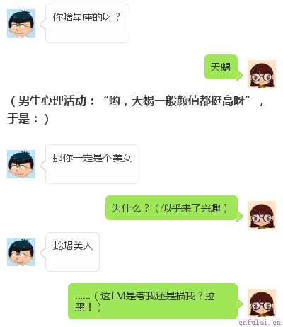 首先,告诉大家,100个男人当中,有90个男人不会聊天,所以不会聊天并没有什么丢人的事,你只是没有正确的方法和技巧。那么,不会聊天是一种什么样的体会?当一个不会聊天的人才开始和女生聊天的时候,他会想:都说女生对星座感兴趣,我先从星座下手吧。