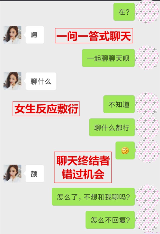 可以发现学员一直都是用”一问一答”的方式和女生聊天,甚至连自己要和女生聊什么话题都不知道,这是非常错误的操作,女生面对这样的聊天,根本不会产生兴趣,所以反应很敷衍,只回复一两个字。通过女生回复的字数和态度,可以看得出来她已经习惯学员这样的聊天,这说明学员之前的聊天都是这个样子,虽然每天都和女生聊,但是完全没有效果,聊到最后,女生连信息都不回复。哪怕女生之前给了学员机会,可是每次都被这样尴尬的聊天终结,久而久之,女生对学员的感觉下降,这就是他彻底失去机会的时候。